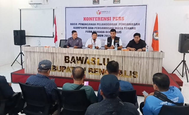 Bengkalis,Riauline.com - Badan Pengawas Pemilu (Bawaslu) Kabupaten Bengkalis, Senin (25/11) menggelar konferensi pers dalam rangka ekspose penanganan pelanggaran selama tahapan kampanye Pilkada Serentak Tahun 2024. Selain itu, sejumlah hasil pengawasan yang dilakukan juga turut disampaikan, seperti pengawasan di masa tenang.