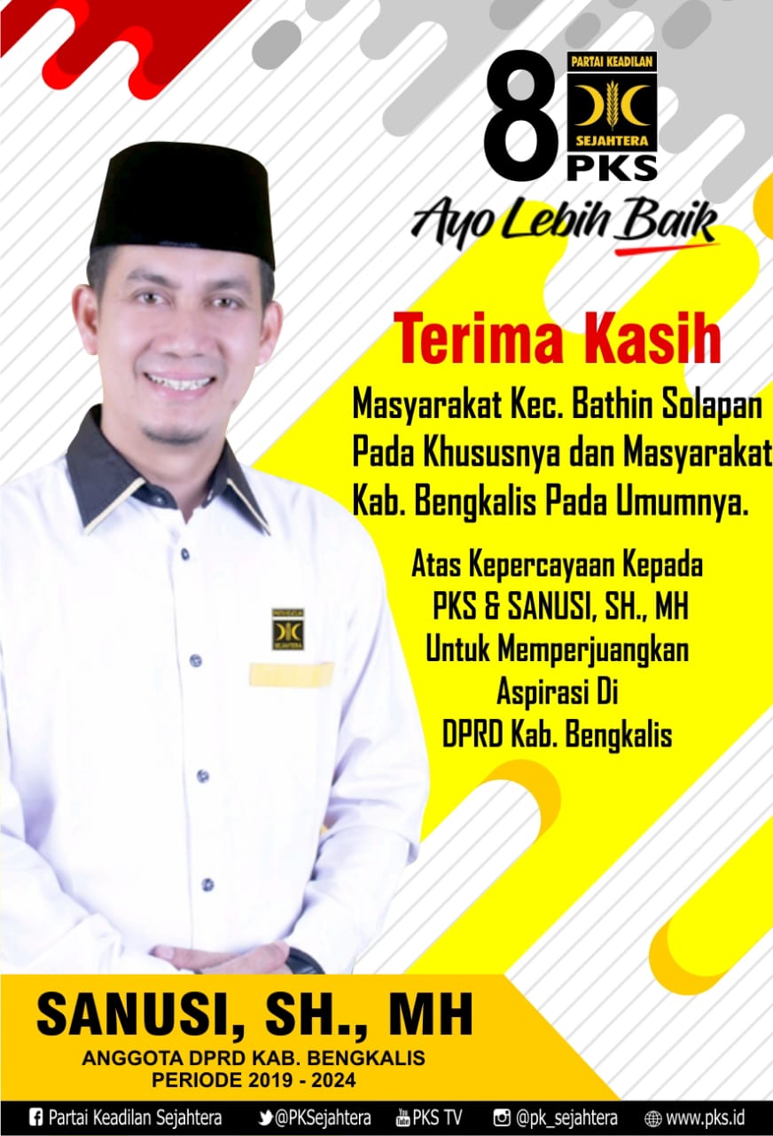 "Terimakasih saya ucapkan kepada masyarakat Kabupaten Bengkalis kususnya Kecamatan Bathin Solapan, atas kepercayaan kepada PKS dan saya atas nama Sanusi,SH.MH untuk memperjuangkan aspirasi rakyat di kursi DPRD Kabupaten Bengkalis." kata Yung Sanusi, Jumat (20/9/2019).
