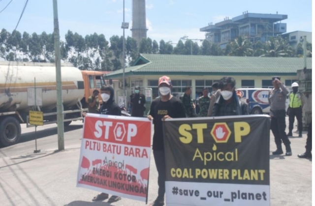 | Warga Desa Kelurahan Lubuk Gaung Kecamatan Sungai Sembilan Dumai menggelar aksi demo di PT. Sari Dumai Sejati (SDS), aksi damai dilakukan sebagai bentuk protes dampak PLTU Batubara milik PT. SDS (APICAL Group) yang diduga mencemari lingkungan s |
