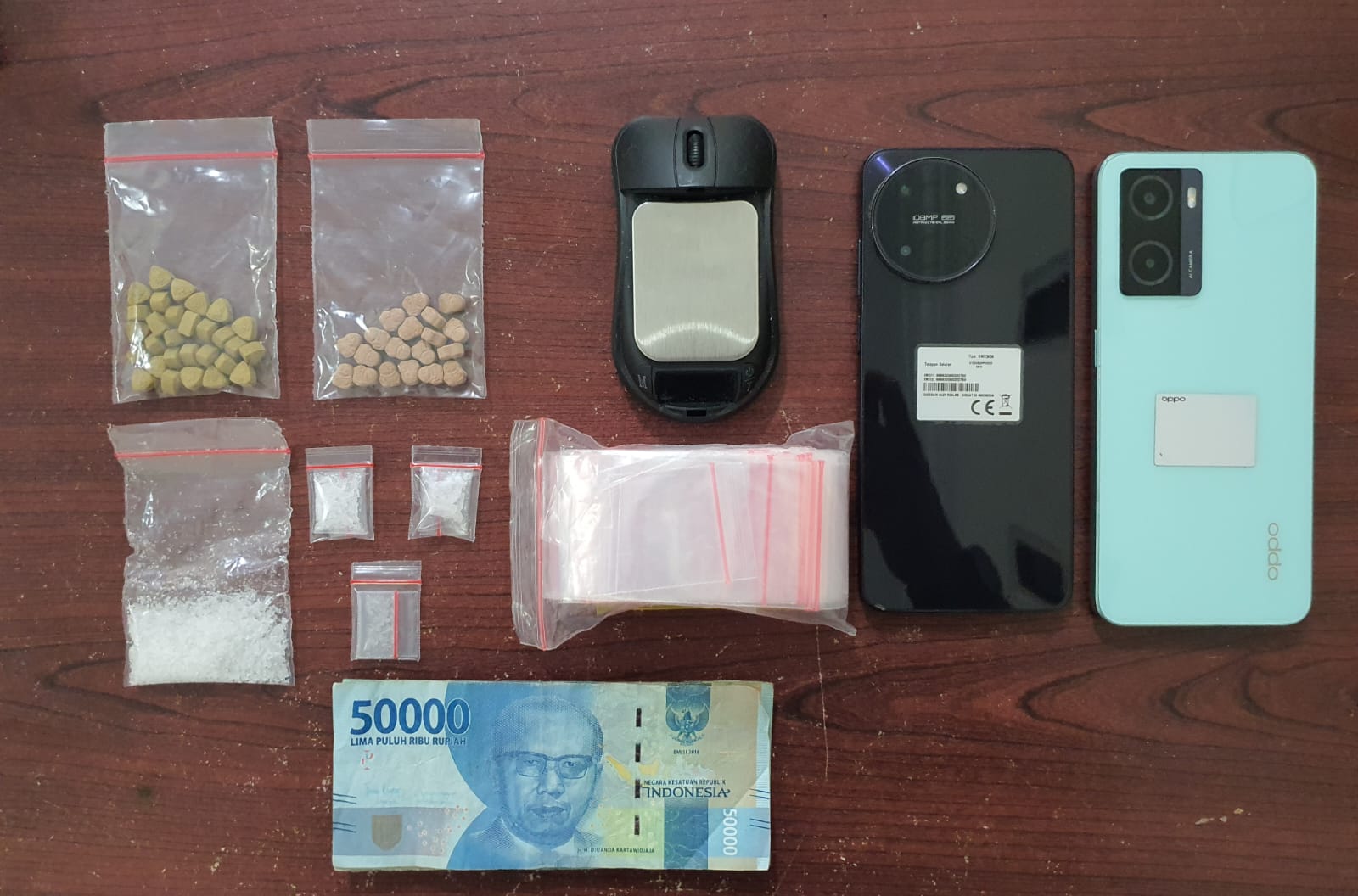 "Barang bukti yang kita amankan empat bungkus plastik pack berisi diduga narkotika jenis sabu berat 6.69 gram, 29 butir diduga narkotika jenis pil extasi logo Singa warna cream berat 8.18 gram, 19 butir pil extasi logo Pinguin warna coklat berat 5.41 gram,timbangan, handpone dan uang tunai Rp300 ribu," ujar Kasat, Minggu (7/1/24).