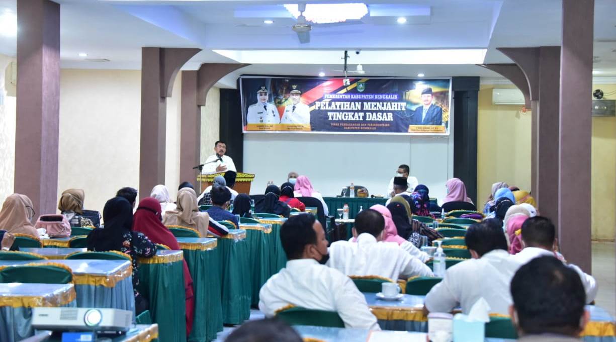 Bengkalis,Riauline.com - Bupati Bengkalis Kasmarni yang diwakili Asisten Administrasi Umum Sekretariat Daerah Tengku Zainuddin membuka pelatihan menjahit tingkat dasar bagi pelaku usaha Industri Kecil dan Menengah (IKM) yang ditaja Dinas Perdagangan dan Perindustrian (Disdagperin) di Hotel Surya Bengkalis, Rabu (18/8/21).
