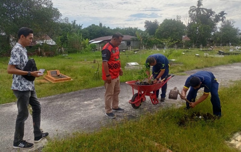 | Kades Sejangat Rahmad Irwandi bersama Kapolsek Bukit Batu Kompol Roni Akbar melakukan penanaman pohon di areal TPU Desa Sejangat dalam rangka mendukung Gren Policing |