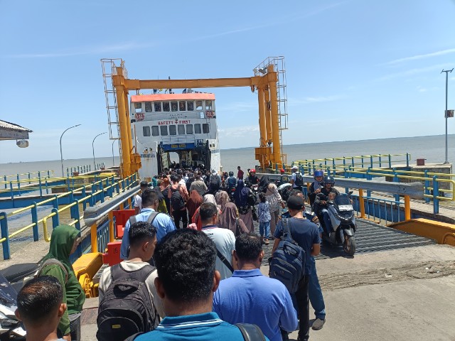 | Terlihat kepadatan penumpang masuk kedalam kapal, akibat hanya satu kapal Roro yang beroperasi melayani rute diljntasan perairan Bengkalis. |