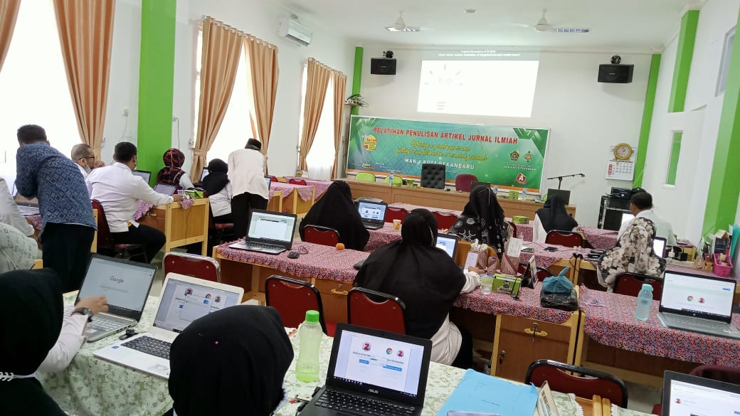 | GELAR PELATIHAN: MAN 4 Pekanbaru menggelar pelatihan penulisan artikel jurnal ilmiah di MAN 4 Pekanbaru yang diikuti guru madrasah negeri se-Kota Pekanbaru, Rabu (30/3/2022) |