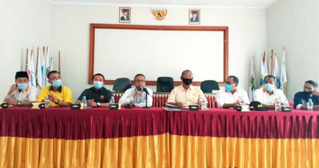 | Ketua Panitia Penjaringan dan Penyaringan Heri Susanto SE didampingi Ketua KONI Abdul Gafar dan jajaran pengurus saat konferensi pers di Aula KONI, Jumat (04/09/2020). |